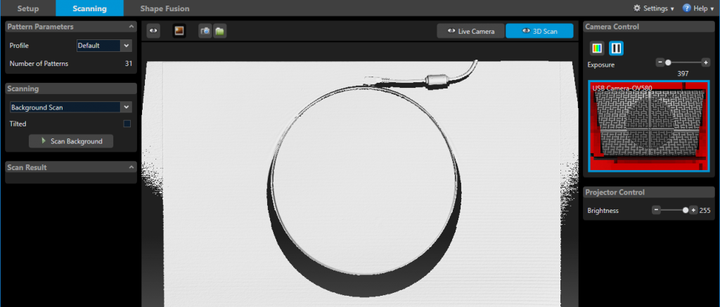 Then it’s just a click of a button to scan the background. Remember that you have to do this every time you switch between Tilt modes or move the turntable. I also recommend re-scanning the background if you have changed the Exposure setting in the panel on the right. Increasing the exposure makes it possible to scan dark objects but you might loose details in white parts of the same object if you do.