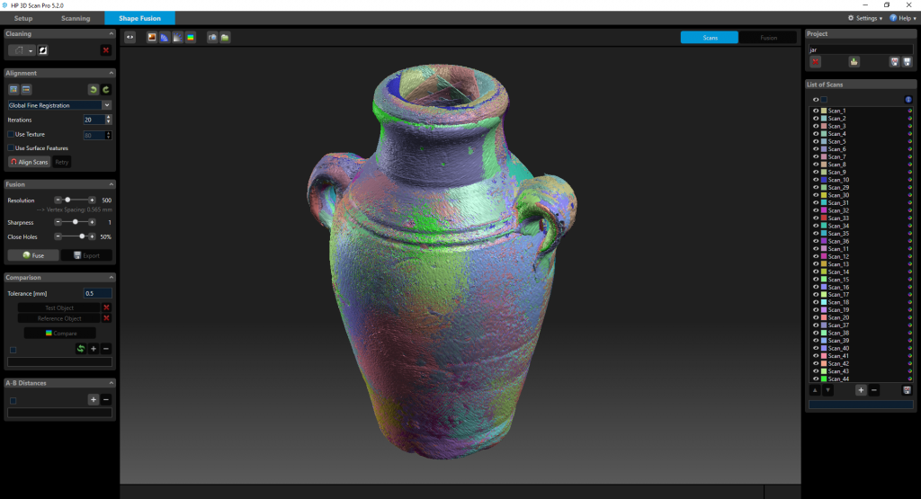 As you can see the software performs coarse and fine registration after each separate scan, so cycles are correctly stitched 90% of the time (if not, increasing the amount of scans usually helps). However, it keeps all scans separately by default so I advice to combine all scans in the List of Scans in the right menu of the Shape Fusion screen after each scan by selecting and right-clicking them.
