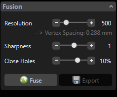 To create a polygonal model from the raw scan data, all scans must be fused together. You can choose the Resolution, Sharpness (Tip: a negative value automatically smooths the result) and set the percentage of holes to fill. The default resolution of 500 processes is quite fast, but you won’t get the most out of the scan data this way.