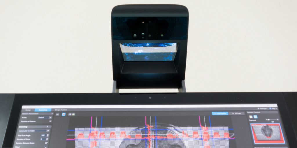 When I tested the 2016 Sprout Pro (which was an updated model from the original Sprout introduced in 2014) I discovered that the integrated and highly marketed Intel RealSense 3D camera wasn’t being used for 3D scanning at all. Instead, the 2016 model came with custom software to make 3D scans using structured light technology. For this, it combined the digital projector and the high resolution camera that are also integrated in the overhead unit.