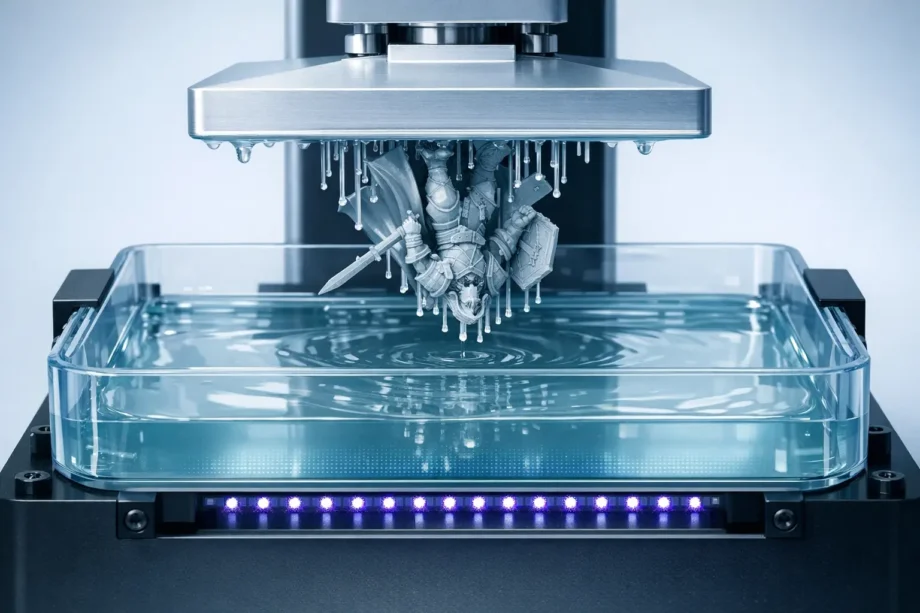 A resin 3D printer is a vat photopolymerization system that forms structures by curing liquid photopolymer resin with ultraviolet (UV) light. [2] In consumer and professional contexts, “resin 3D printer” commonly refers to stereolithography (SLA) (laser-scanned), digital light processing (DLP) (projected), and masked SLA (MSLA) (LCD-masked) variants. High-detail 3D prints are enabled by thin layer heights and fine optical sampling, such as 405 nm light engines and small pixel or spot dimensions. [2][3][4]