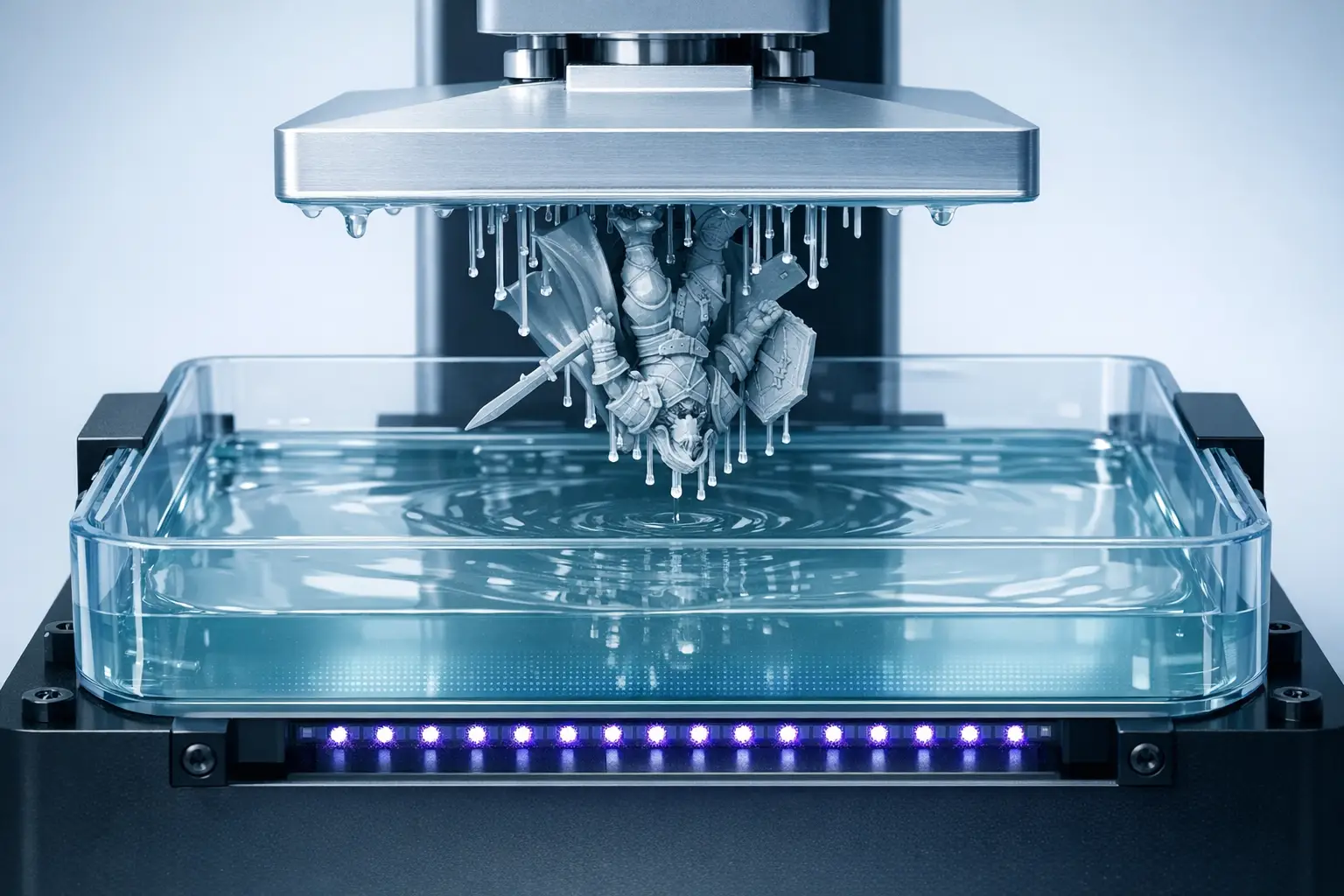 Vat photopolymerization is the umbrella family for resin printing processes that cure a liquid photopolymer resin with ultraviolet light to build parts layer by layer. [2] In practice, the term is used for multiple exposure architectures that share common workflow elements: a resin vat, an exposure system, Z-axis motion for layer stacking, and post-processing steps such as wash and cure (solvent washing followed by UV curing).
