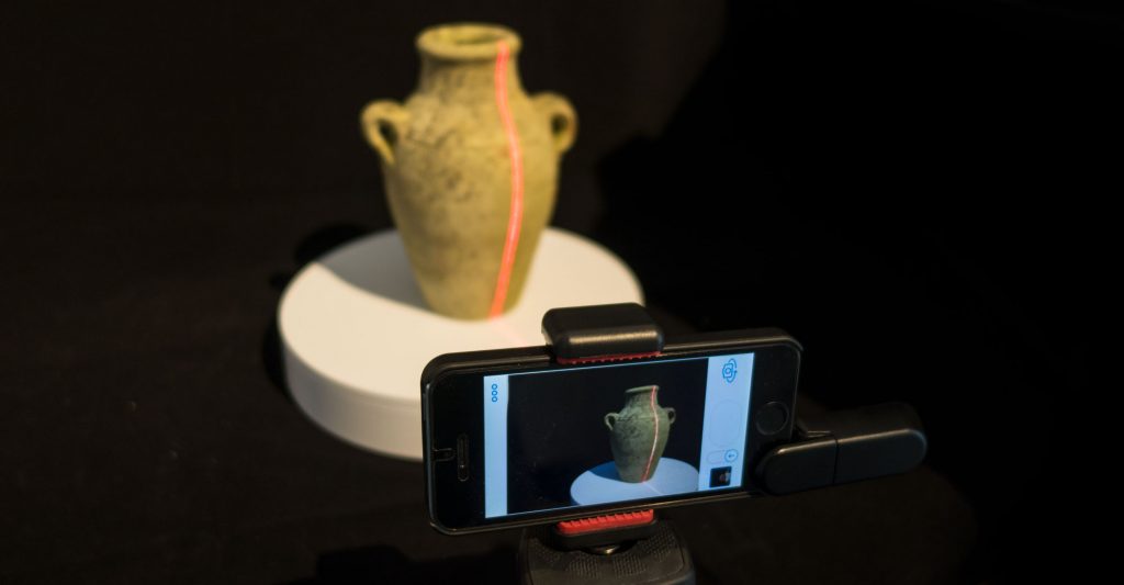 Although it basically uses the same concept of a laser (a green one in that case) and the smartphone’s built-in camera, it seems to do so in a more sophisticated way (the laser and turnbtable both move) that takes human error out of the equation. It’s not meant for scanning people but it can take full — and apparently high resolution — 360° scans of small objects which could actually be usable for many purposes.
