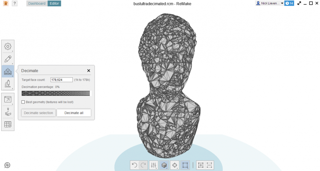 While the lack of control over the photogrammetry process is ReMake’s weak point, it shines when it comes to editing and optimizing complex meshes. All the tools you need are in the menu on the left and from top to bottom they’re in the order of the workflow you should follow. Each tool has a clear icon and settings are, again, kept to a minimum to keep the workflow easy and efficient.