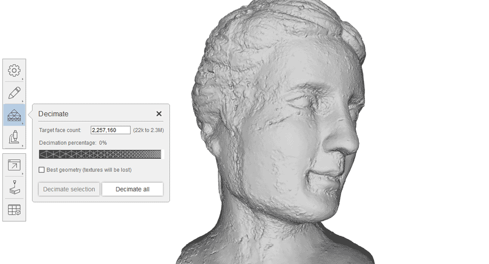 Decimation takes a while to process (the animation above is not real-time). But as you can see, I was able to reduce my 2.3M poly bust to about 500k without losing too much details. However, the results get crazy if you push the decimation to the limits. I tried to decimate the Ultra-quality model above to the 23k polycount of the Standard-quality model and this is what I got: