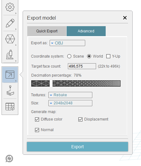 What’s also nice is that you can decimate the model and rebake textures on export. The system is smart enough to estimate the relation between polycount and texture resolution. So if you choose to rebake to a 2K texture, it will select a matching decimation percentage (which you can overrule).