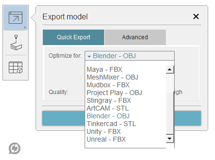 The main feature, of course, is exporting the 3D model. Here, ReMake offers a lot of functionality — at least, in the Pro version. The Free version only let’s you Quick Export models based on presets for other programs, but there are a lot to choose from. Of course Mudbox and other Autodesk apps are covered, but also many third party 3D modeling apps like Blender, and game engines like Unity and Unreal. Each preset has 3 quality settings that determine the polycount and texture size.