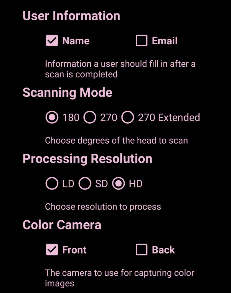 When scanning in a user-facing manner the app will guide the user using voice commands. To make a 3D selfie you’re asked to rotate your head to both sides. Depending on weather you’ve chosen a 180-, 270- or extended 270-degrees scan, you’ll have to rotate your head further.