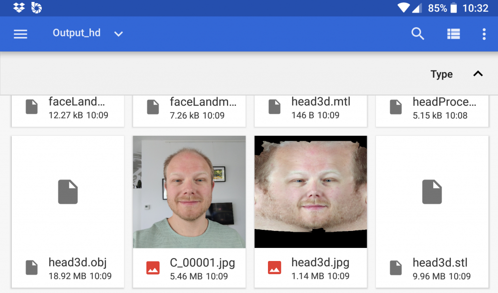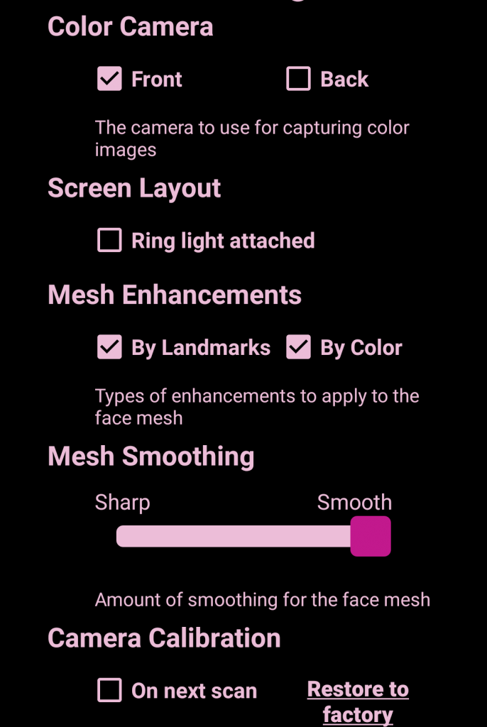 You can tick a box to calibrate the camera on the next scan. This is a fully automatic process and doesn’t require any kind of calibration board. It’s simply done after a normal face scan. And I didn’t really feel it was necessary: Even when switching between devices the textures aligned nicely with the geometry. This is probably because the software uses the detected face landmarks on the geometry to map the texture correctly.