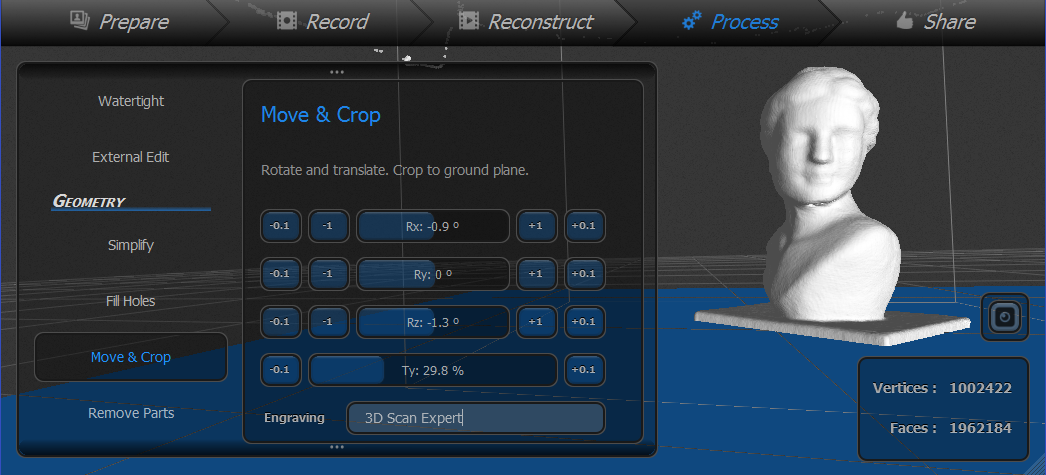 The Geometry section allows you to Simpify (decimate) the model and perform hole-filling operations. The latter is quite comprehensive because it also supports non-watertight methods. Move & Crop (pictured below) not only allows fine control over rotation and floor-level cropping but can also engrave the floor surface with a text. This can be handy for branding or copyrighting models.