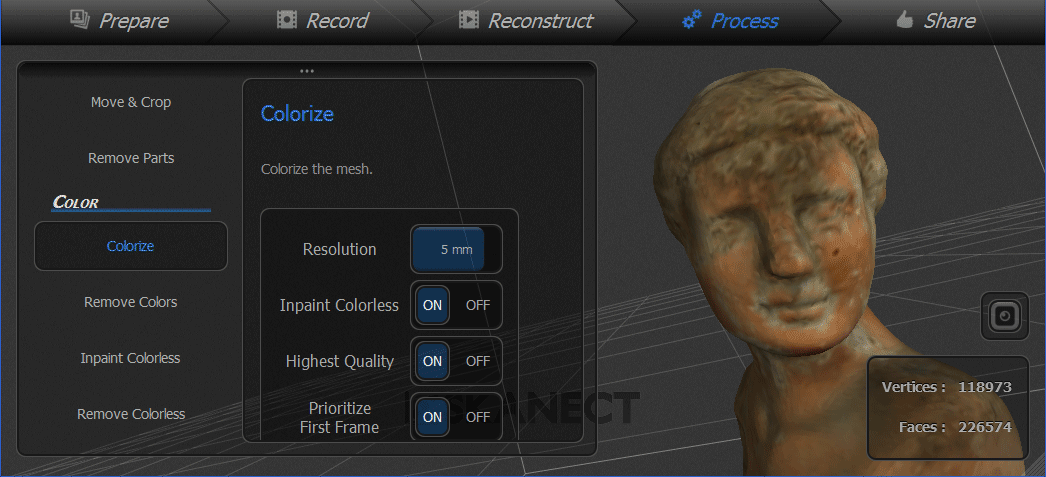 Color unsurprisingly let’s you apply color to the model. If you chose the High Resolution color setting, Skanect will use the separate photos as much as possible and fill in the remains with the lower-resolution color if necessary.