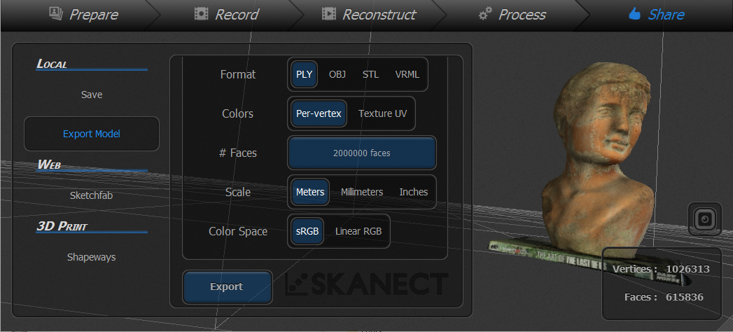 The Share tab contains all saving, exporting and sharing functions. Exporting can be done to .PLY .OBJ .STL and .VRML. You can opt for Skanect’s native per-vertex coloring or let the software generate a UV texture map.