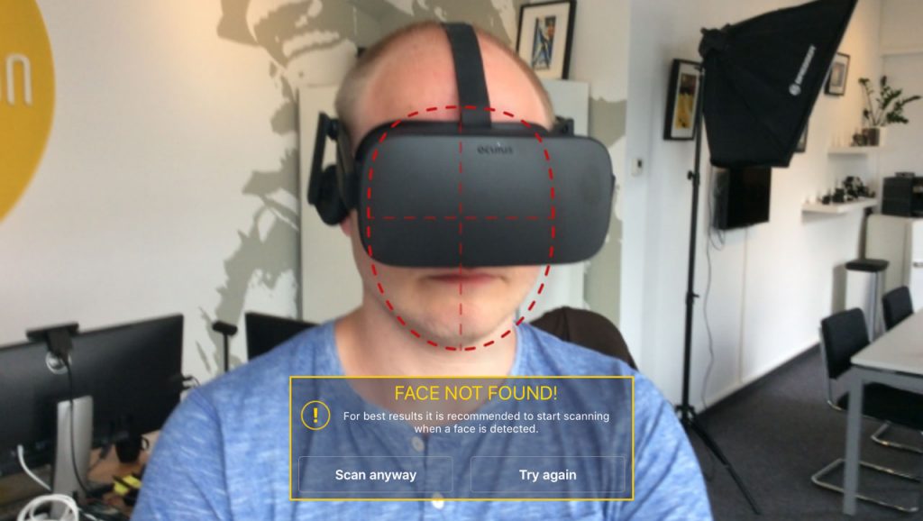 People scanning mode requires your subject to have a face. That sounds obvious and the face-detection is excellent, but it prevents scanning people with helmets—or shiny new VR headsets. The upside is that the algorithm knows where the face is and makes sure that part is covered by a single photo. This ensures that the face is textured correctly.