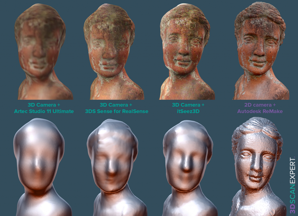 I’ll start with some test scans of the very same 40 cm tall stone bust with various software. It must be noted that the small 200 Watts softbox light kit wasn’t sufficient for this sensor. I had to install my large 2500 Watts studio kit (you can check which light kits I’m using here) to get somewhat decent scans. The main problem here is the RGB camera on the RealSense R200, which isn’t very light-sensitive and is very prone to noise. This greatly impacts the texture quality. And as with most infrared depth sensors, the R200 can’t be used outdoors. Even on cloudy day the natural infrared light from the sun will interfere with the sensor.